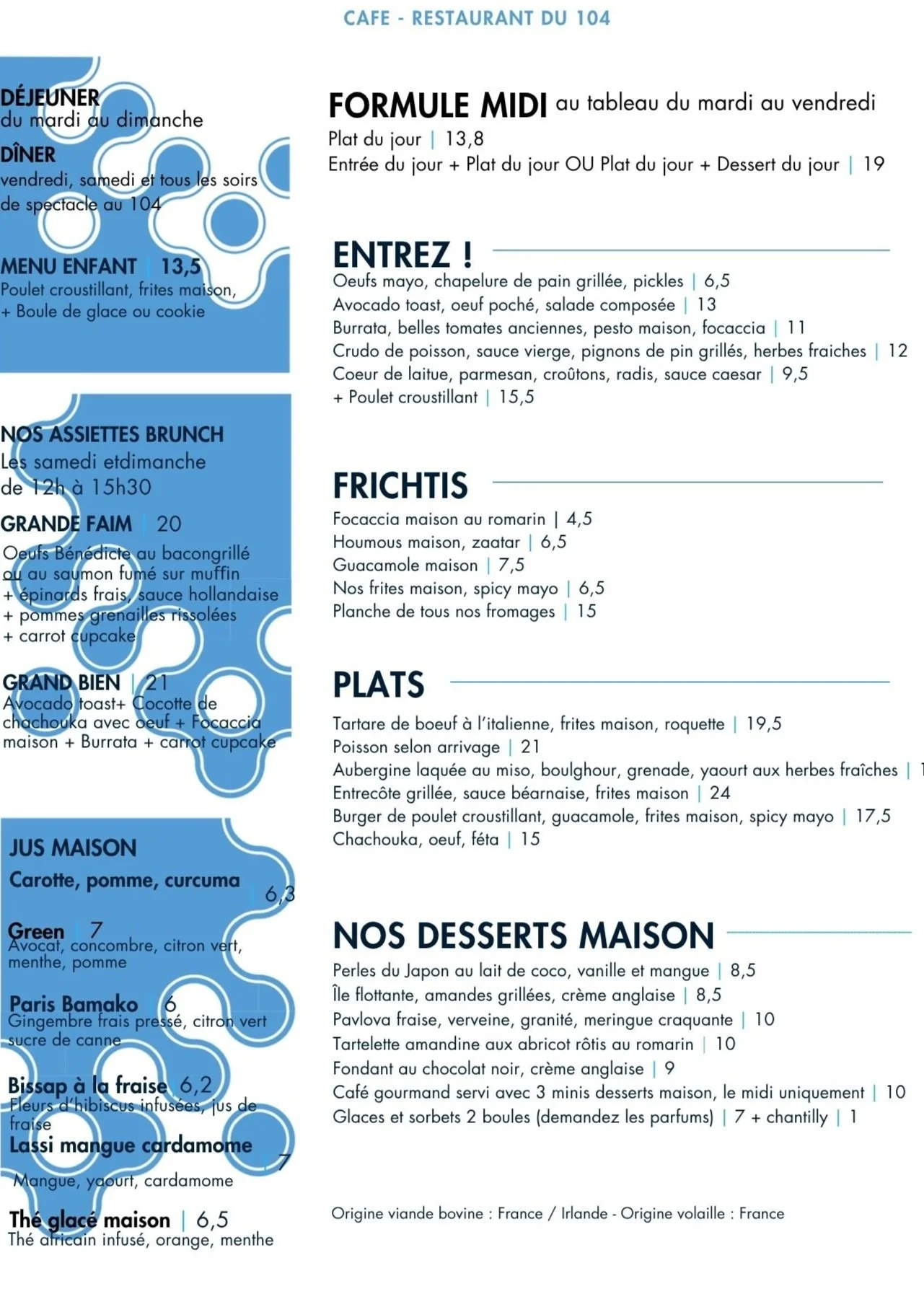 café restaurant du 1045 Rue CURIAL — 75019 PARIS09 51 22 76 44info@granDcentral-104.parisCARTE DE SAISONnos BOISSONSRÉSERVATIONDéjeuner du mardi au dimanchediner du JEUdi au samedi + soirs de spectacleContact pour vos demandes d’évènements et privatisationssuivez-nous !